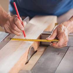 Each wood log is thoroughly inspected for quality and defects. Markings are made to indicate ideal cutting lines based on grain direction, length, and intended final product dimensions.